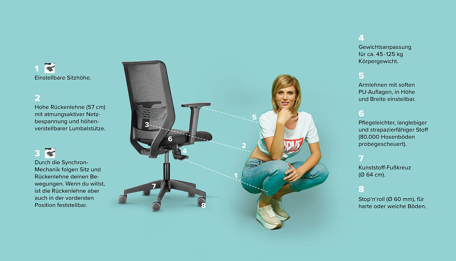 Platz nehmen in der Komfortzone. Während du deine Arbeit stemmst, erledigt dein to-sync work zuverlässig seinen Job und steht dir mit seinen serienmäßigen ergonomischen Features zur Seite: Mach es dir maximal bequem dank harmonisch abgestimmtem Bewegungsablauf, verstellbarer Sitztiefe und Armlehnen, ergonomischer Rückenlehne und Lumbalstütze.