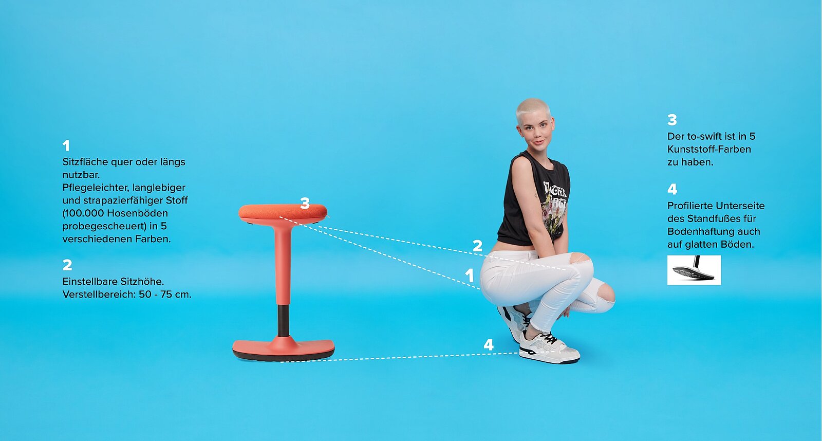 Für agiles Arbeiten mit Spaßfaktor: Individuell in der Höhe verstellbar und mit Wippfunktion versehen, ist der Steh-Sitz-Hocker to-swift von Trendoffice dein flexibler Begleiter im Büroalltag – oder auch bei der kreativen Pause.