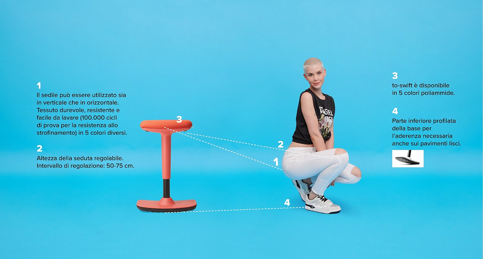 Per il lavoro agile con un pizzico di spensieratezza: regolabile in altezza in base alle esigenze individuali e con meccanismo basculante, lo sgabello per lavorare seduti/in piedi to-swift di Trendoffice è lo strumento flessibile per l’ufficio – o anche per una pausa creativa.